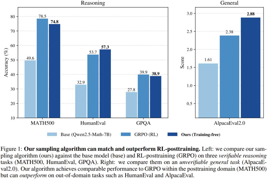 这个从根本上简单且无需训练的采样算法所取得的惊人成功,凸显了现有基础模型潜藏的推理能力。