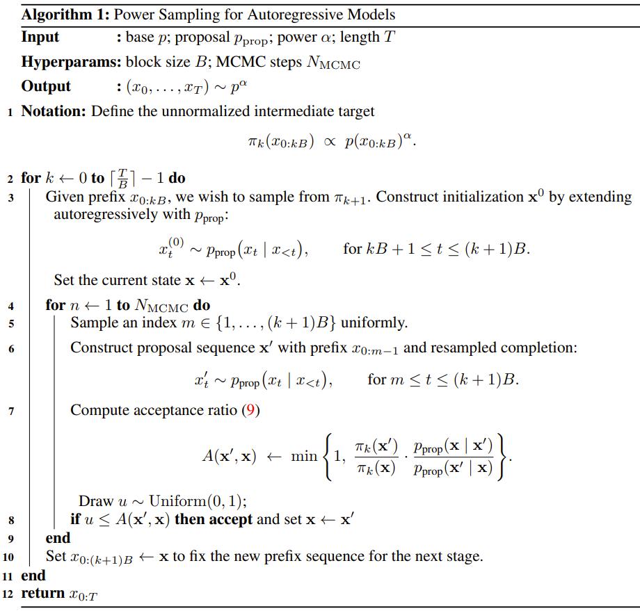 给定一个 LLM p,我们可以获取任意序列长度的 p^α 的值;然而,这些值是未归一化的。直接从真实概率进行采样需要对所有序列 (x_0, ..., x_T) 进行归一化,这在计算上是不可行的。