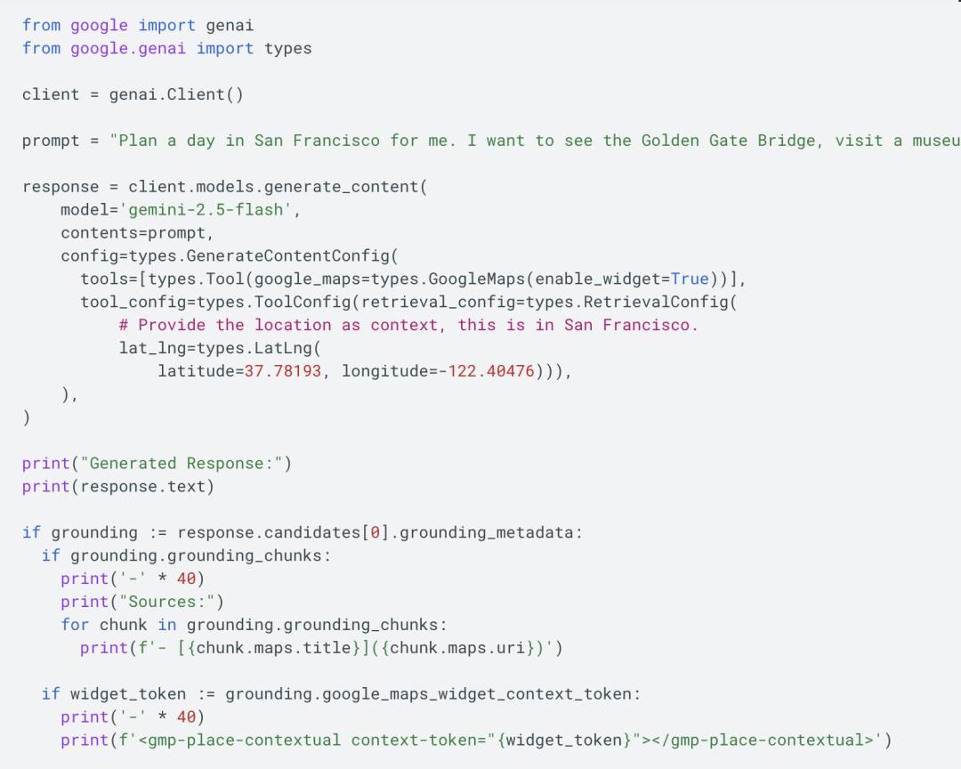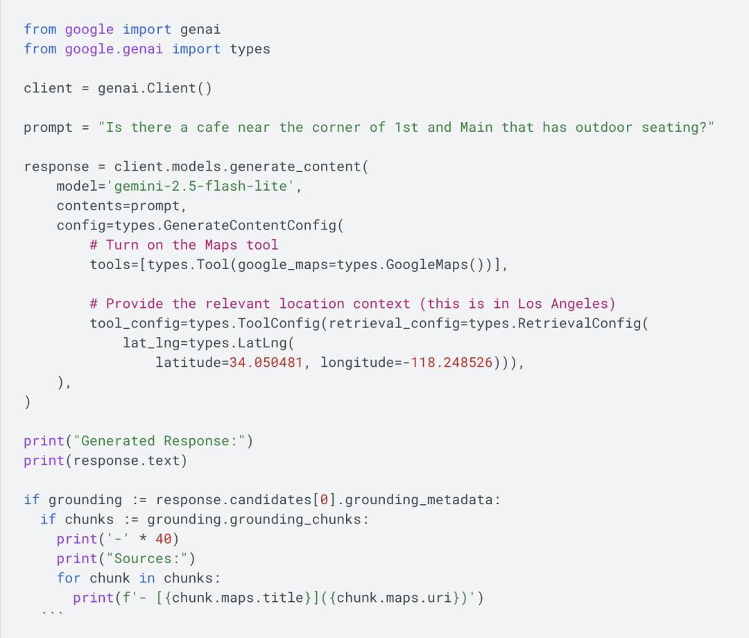 就像谷歌搜索锚定(Grounding with Google Search) 一样,谷歌地图锚定(Grounding with Google Maps)也能在涉及位置的信息查询中,为模型提供丰富且实时更新的数据支撑。