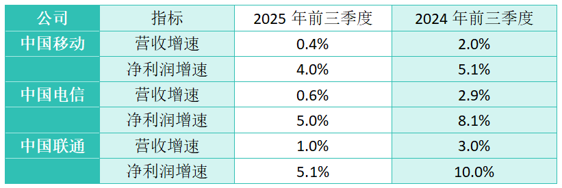 此外,通过对三家运营商的营收和净利润进行加总估算,2025年前三季度相较2024年同期,三家公司整体营收微增0.57%,整体净利润则增长4.35%。净利润增速显著高于营收增速,表明运营商在成本控制、业务结构优化和高效运营方面取得成效,盈利能力提升。