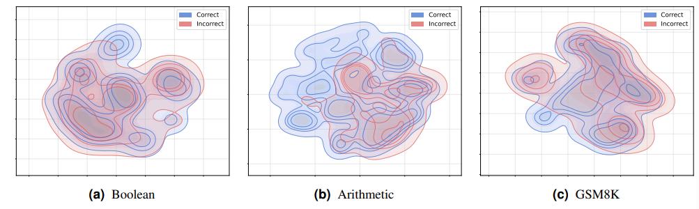 不同任务中正确与错误推理的拓扑特征分布。图中蓝色表示正确推理,红色表示错误推理。