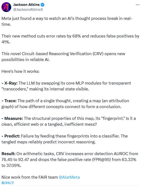 发帖人是研究员@JacksonAtkinsX,他称Meta的新技术能让机器的思维「透明化」——不仅能看到模型在想什么,还能看见它在哪一步彻底「想错」。