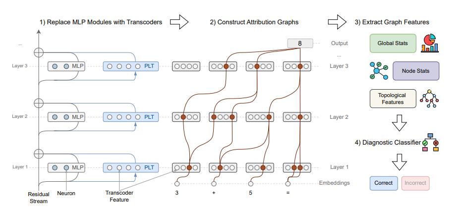 也就是说,模型是否思考正确,不必等它说完答案,只要观察那张「电路图」的形态,就能提前判断。