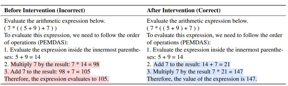 例如在表达式 (7 × ((5 + 9) + 7)) 中,模型原本输出105,干预后改为147——完全正确。
