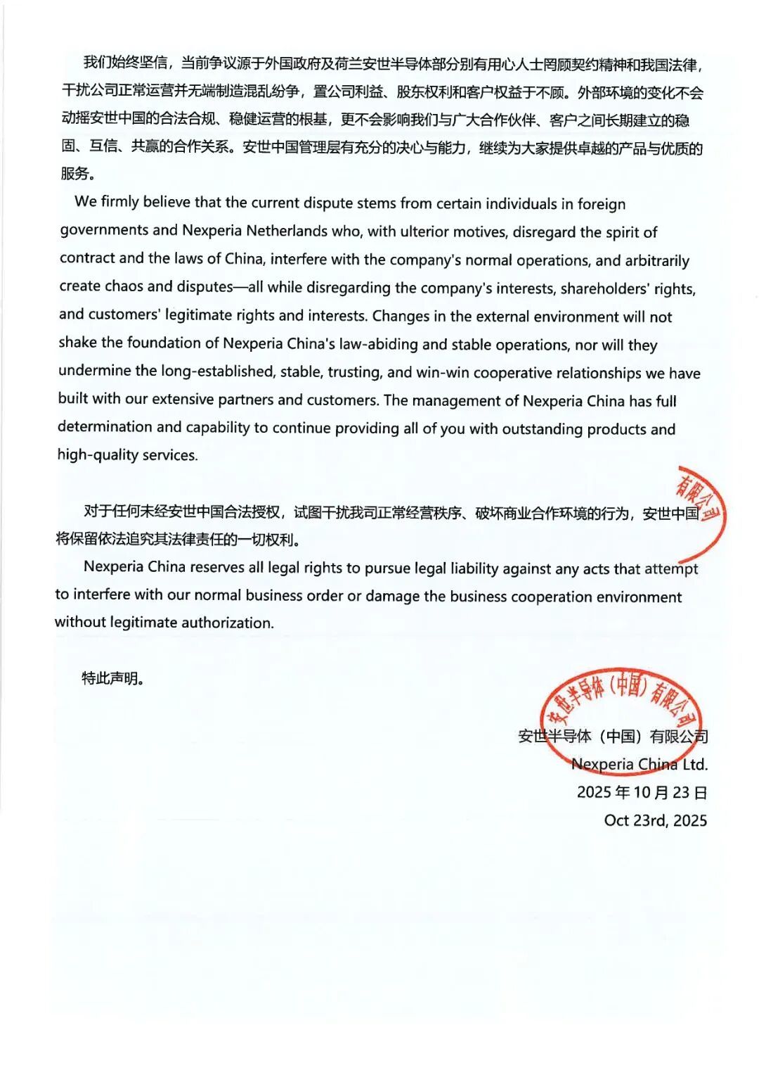 四、安世中国业务运营一切正常,目前,安世中国所有业务活动、生产运营及对外合作均在法律与管理制度框架下有序、正常开展,不受任何外部单方面决定的影响。我们完全有能力确保业务的连续性与稳定性。