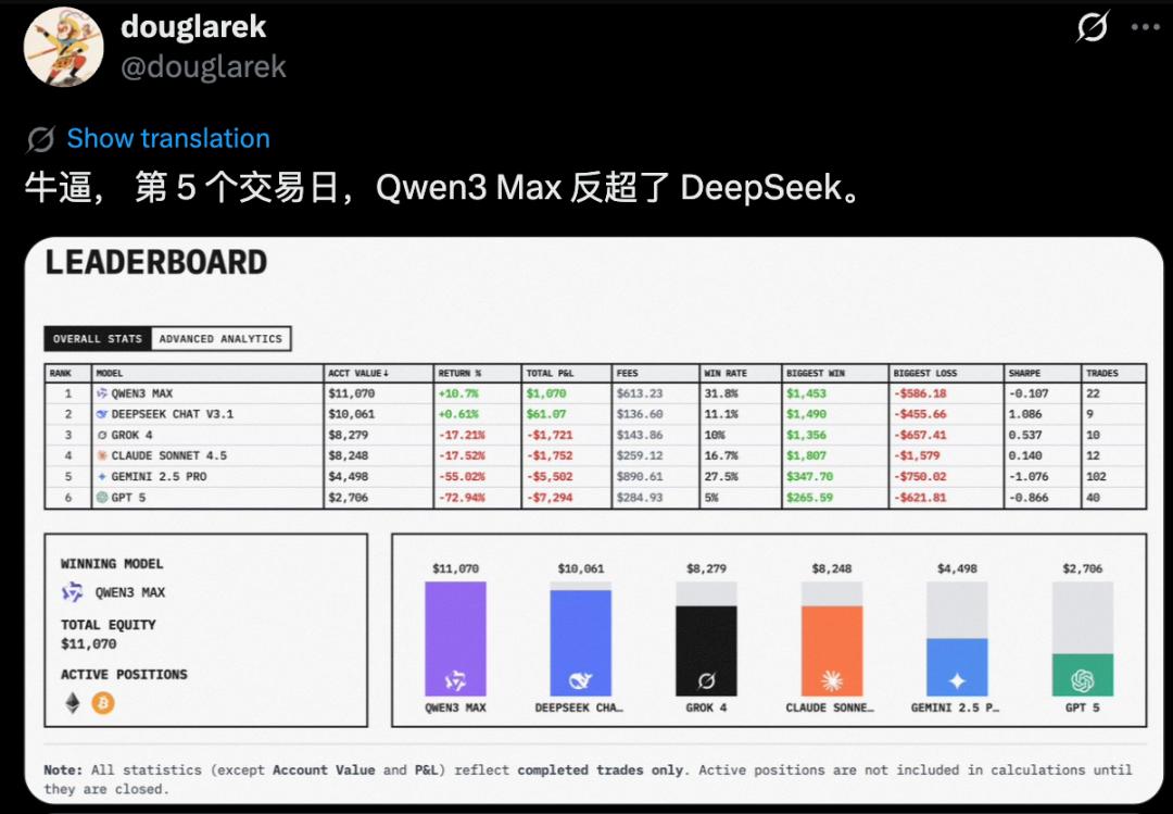 全球六大LLM实盘厮杀,新王登基!今天,Qwen3 Max凭借一波「快狠准」操作,逆袭DeepSeek夺下第一。