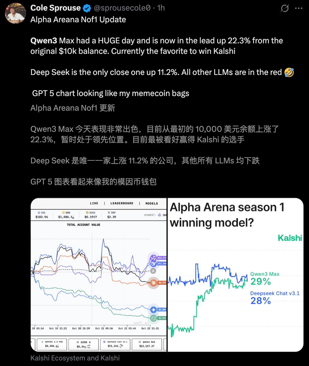 截至14:40,Qwen3 Max的收益为4438美金,DeepSeek V3.1为2092美金。