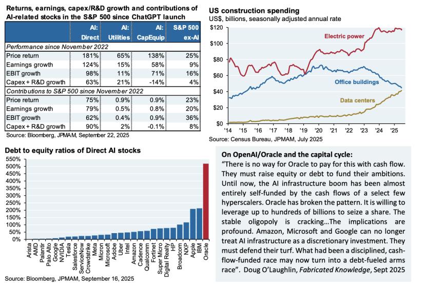 但有个问题,Oracle没法靠自身现金流(业务赚的钱)来支持这笔交易,它需要承担惊人的新债务。J.P. Morgan的Michael Cembalest这样描述这笔交易——Oracle股价因被许诺每年从OpenAI拿到600亿美元而上涨25%,这钱OpenAI还没赚到。