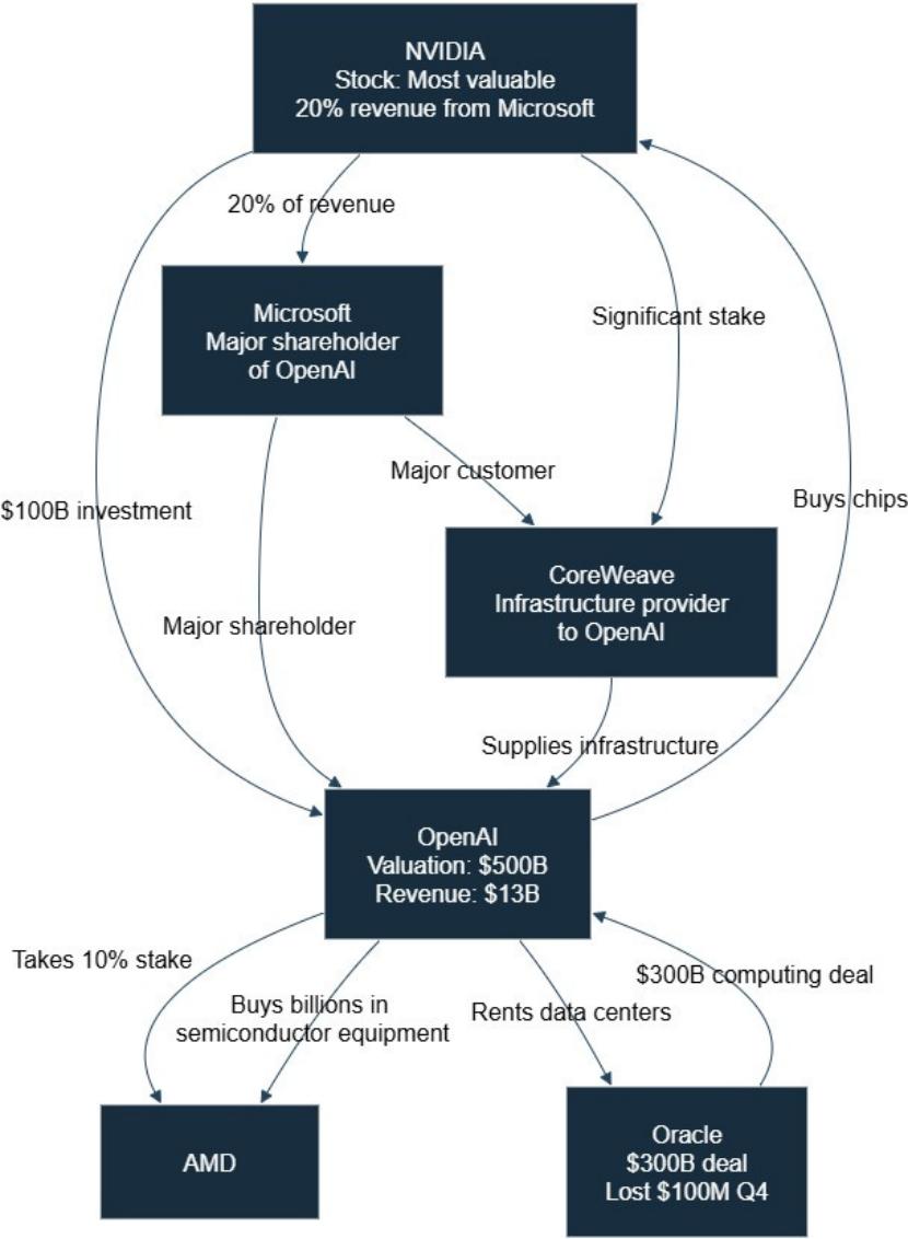 Azeem Azhar:我觉得和互联网泡沫很不同。彼时也有循环的供应商融资,但多是债务,不是权益,技术性上不同;而且花的钱常常是“假”的,下行时没人用那些光纤。我们直到2012、2013年,也就是YouTube真正爆发时,才开始用上那些光纤。今天的差异是,这类交易多用权益;很多都是分期,要达到里程碑才兑现;而且美国乃至全球的企业前所未有地强烈需求这种技术。它难看吗?我现在屏幕上就开着你说的蜘蛛网图,确实,你应该看着它觉得“不对劲”。