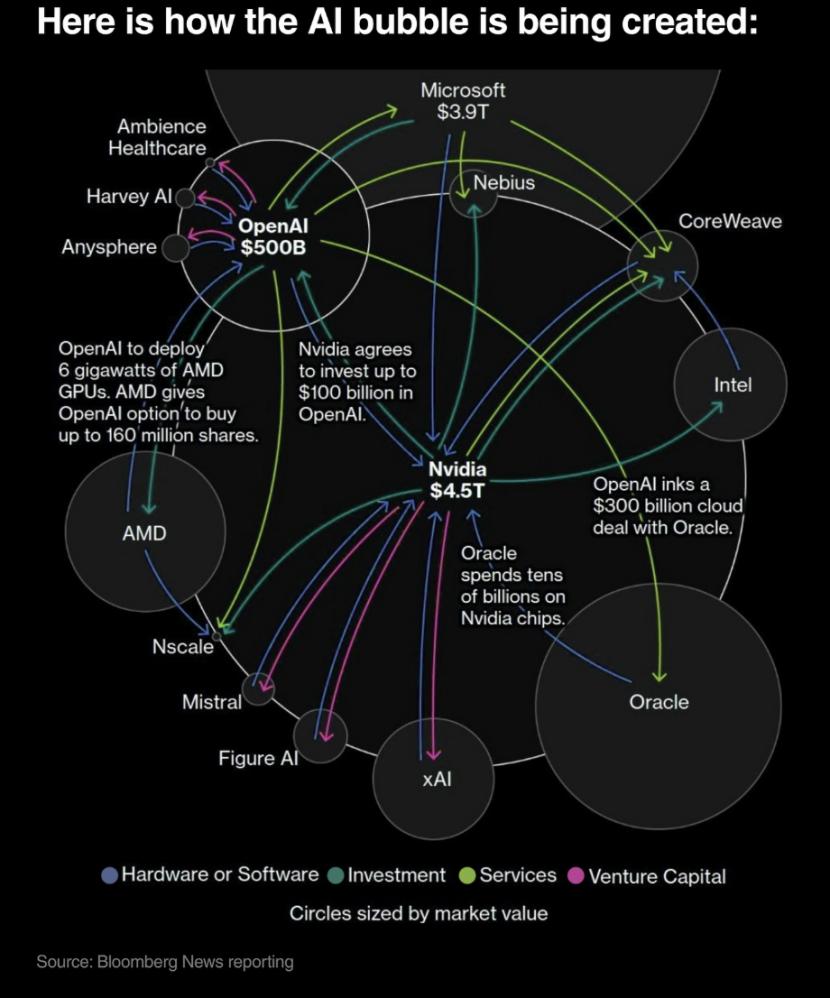 比如Nvidia说要向OpenAI投资1000亿美元,作为回报,OpenAI同意向Nvidia买数十亿美元的芯片。之前,OpenAI又和Nvidia的对手AMD签了合约,买数百亿美元的芯片,作为交换,OpenAI将获得AMD约10%的股份。这就像“我会买你10亿美元的东西,只要你给我10亿美元的股票”。到某个点,这一切像一个极度互相牵连的估值蜘蛛网。你觉得这和互联网泡沫相比,有何相同或不同?