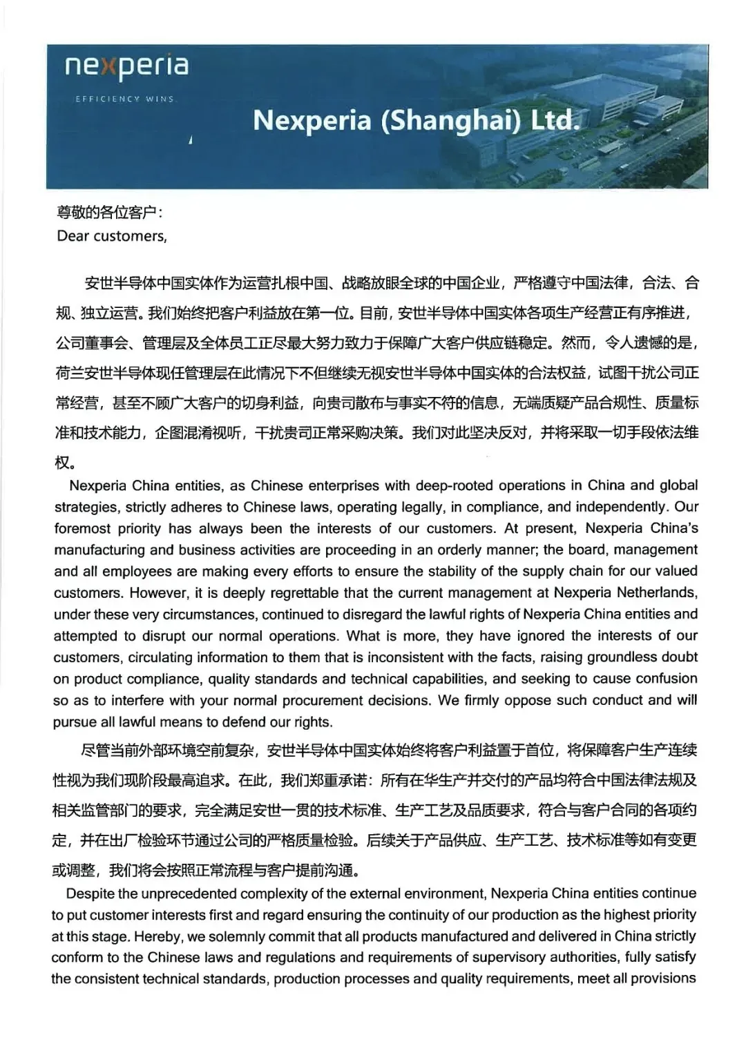 近日,荷兰安世半导体向其客户发出警告,表示无法再保证来自其中国工厂的芯片质量,警告客户不要购买中国工厂生产的安世半导体芯片。作为回应,10月23日中午,安世半导体(上海)有限公司向客户发布了一封公开信,针对荷兰安世半导体现管理层的行为进行了回应,并重申了其对中国客户的承诺。