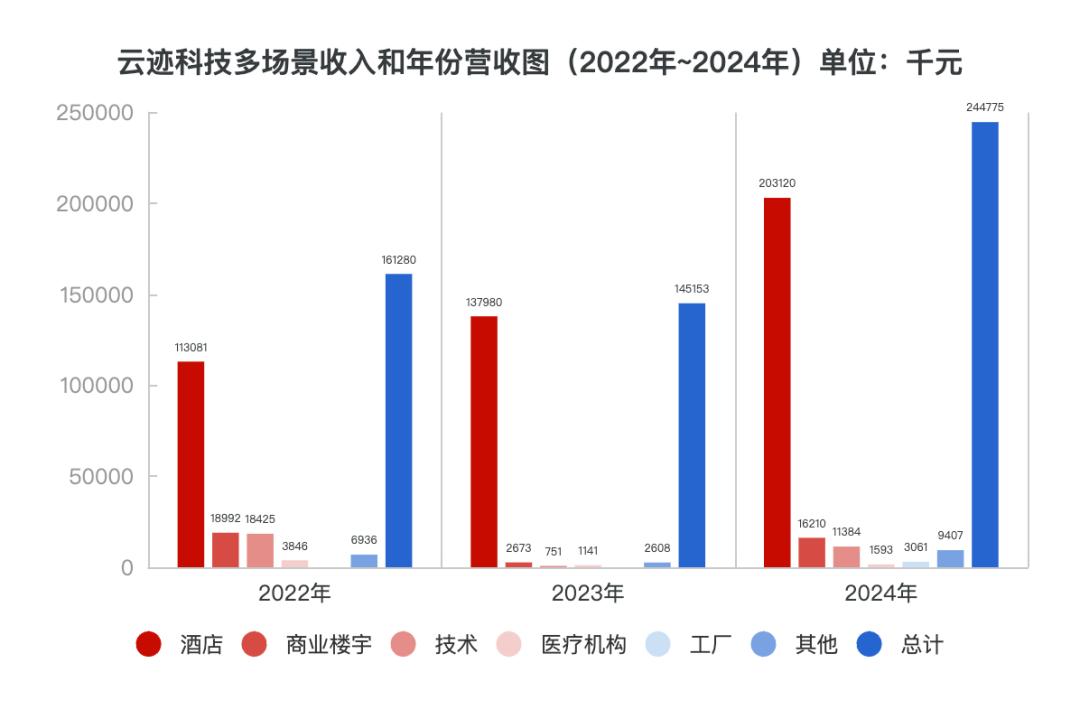 只是,资本市场往往更在乎一家公司的营收结构。对于云迹科技而言,它的优势也是劣势,因为,它的营收中有超过八成来自酒店场景。换句话说,它几乎把所有筹码都押在一个行业的变化上。当酒店业进入“降本提效”的周期,这种依赖就显得格外脆弱。