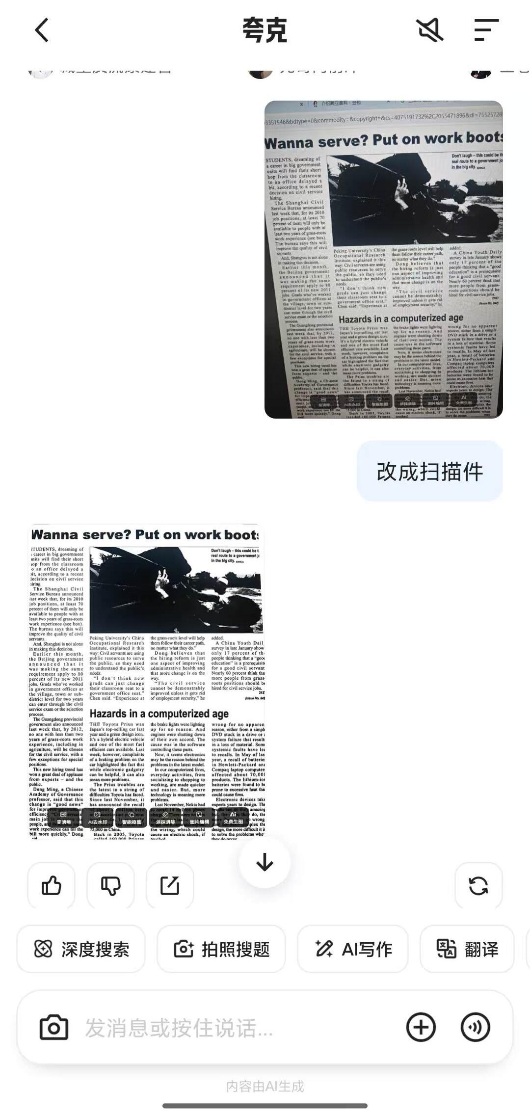 除了传统的对话,夸克对话助手还继承了夸克APP的传统优势——一套办公功能,比如它可以直接把图片变成扫描件: