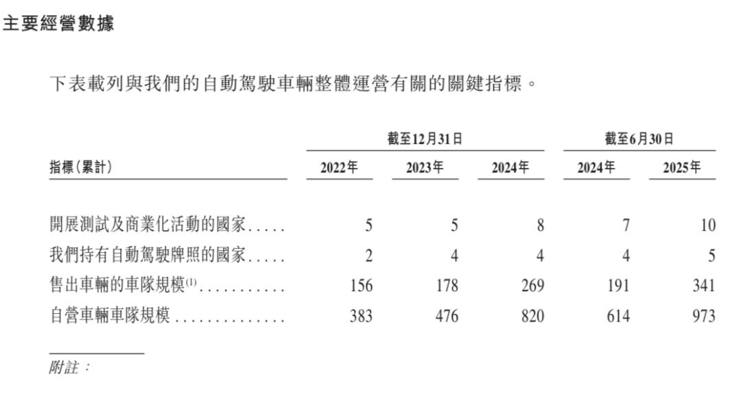 文远知行重点展示其持有牌照的国家数、商业化活动国家数、售出车辆和车队规模,以体现其国际化优势。到 2025 年上半年,文远自营车队达到 973 辆,售出车辆 341 辆,测试及商业化活动覆盖 10 个国家,拥有自动驾驶牌照的国家增至 5 个,其Robotaxi 板块在半年内增长 385% ,不仅得益于国内放开的商用城市,更源自中东市场的运营试点。