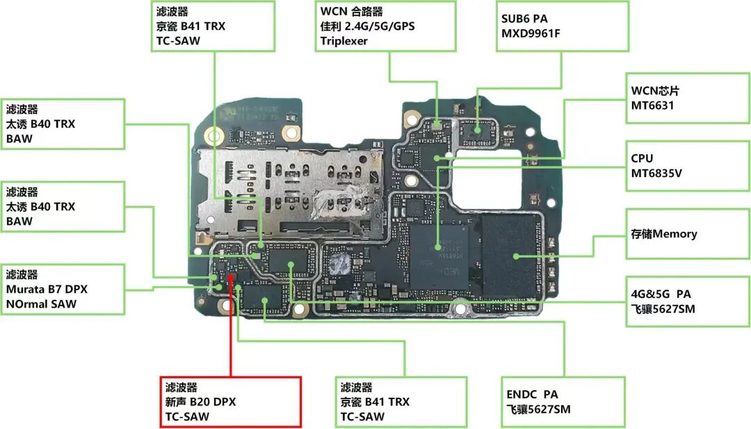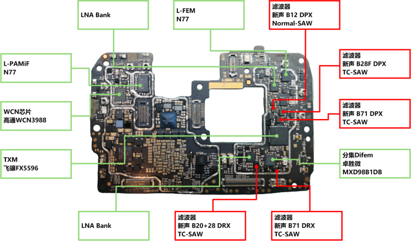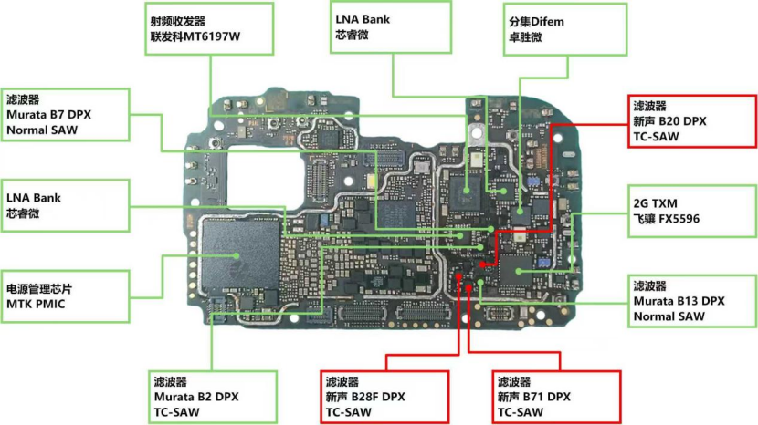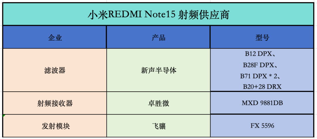 在小米REDMI Note15中,其同样采用了包括新声半导体在内的多款国产滤波器,如新声B12 DPX、新声B28F DPX、新声B71 DPX和新声B20+28 DRX滤波器等,同时,也采用了卓胜微的分集Difem和飞骧科技的TXM。