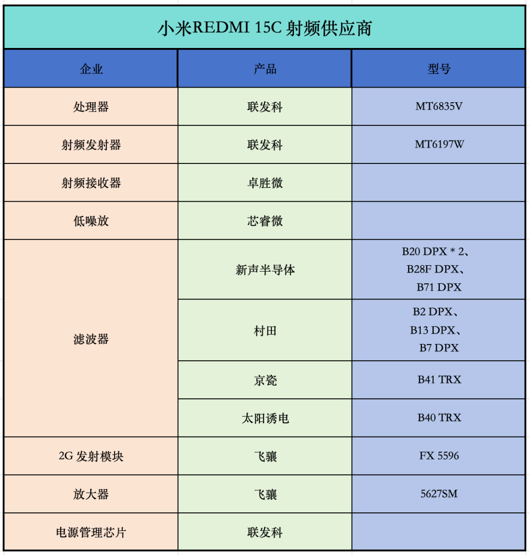 2、从产业链来看,小米REDMI Note15/15C系列均为龙旗科技 ODM 项目,其中射频前端领域由新声半导体提供多款滤波器;