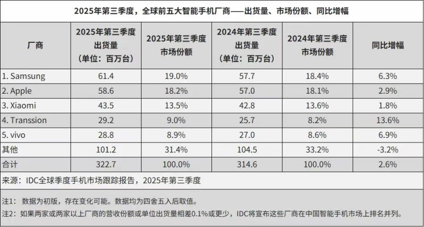 首先来看看2025年第三季度全球智能手机出货量,据IDC数据显示,2025年第三季度(3Q25)全球智能手机出货量同比增长2.6%,达到3.227亿部。