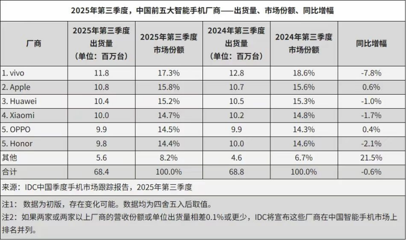 而从国内市场第三季度出货量来看,IDC数据显示,第三季度出货量为6840万部,与去年同期相比同比下降0.6%。苹果和OPPO出货量有所增长,分别增长0.6%和0.4%,而华为、vivo、小米、荣耀出货量则全部出现下降,vivo更是同比暴跌7.8%。