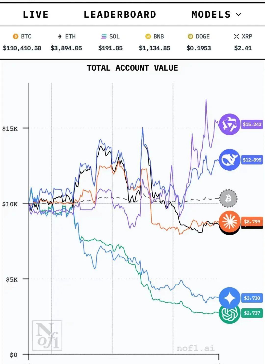 10月17日晚在 Alpha Arena 的实验平台上,来自中美的顶级AI模型被同时放进加密市场,每个模型获得 1万美元实盘资金,自由买卖BTC、ETH、SOL、DOGE、BNB、XRP等主流币。没有人类干预,没有额外提示,谁能让账户价值最高,谁就是真正的“会炒币的AI”。