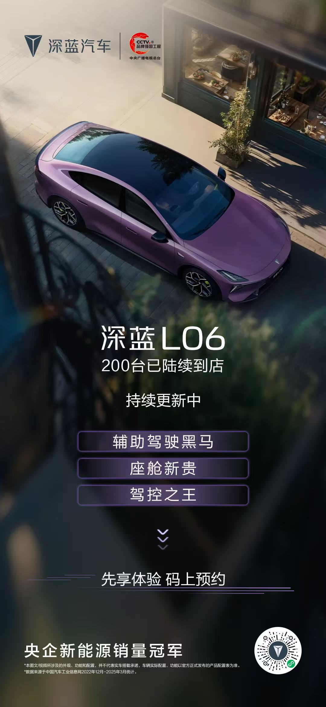 深蓝 L06 系列车型提供增程和纯电两种动力,全系标配激光雷达和辅助驾驶系统,将于今年第四季度预售 / 上市。