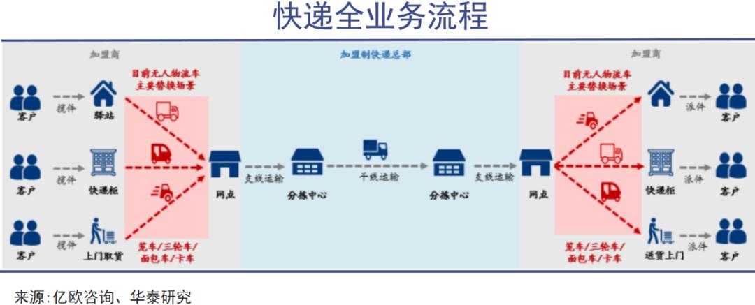 一个简化的快递流程是:揽件→支线运输→中心分拨→干线运输→中心分拨→支线运输→派送。目前最适合无人车大规模应用的商业场景,就是快递末端配送中“网点到驿站”这一段