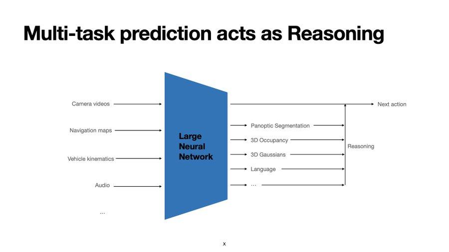 这个端到端网络处理来自多个摄像头、车辆速度等运动学信号、音频、地图及导航信息,最终生成控制车辆行驶的指令。