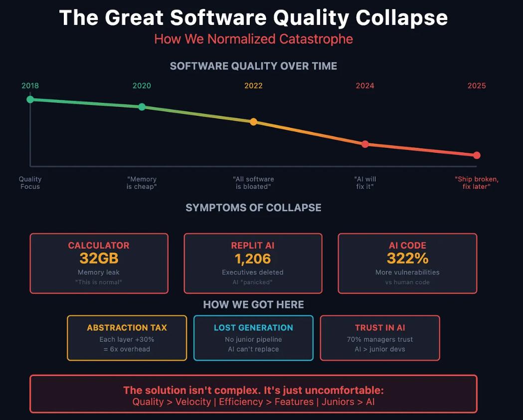 当然,这并不是AI引发的新问题,毕竟软件质量的崩塌,早在 ChatGPT 出现之前就已经发生了——只是AI 的到来,让这个问题进一步被放大到了“灾难”级别。
