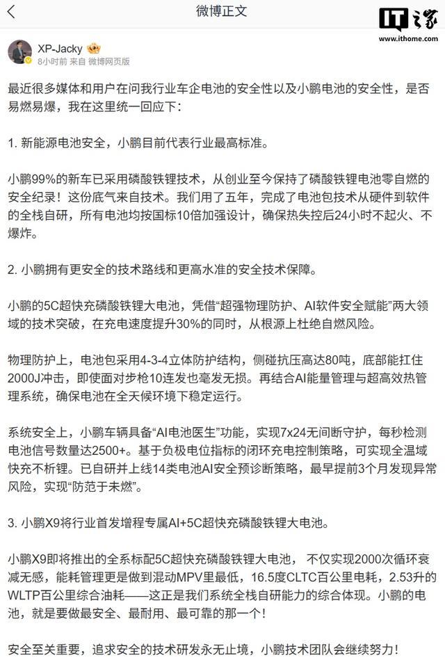 IT之家 10 月 27 日消息,小鹏汽车动力总成高级总监 @XP-Jacky 今日发文,回应了电池安全性等问题。
