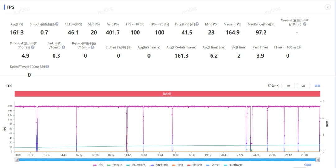 针对这块 165Hz 高刷屏,托尼还额外测了三角洲行动,一局大战场下来,平均帧161帧,在死亡时会有掉帧,其余时候基本稳在165帧,这一点从中位数164.9帧就能看出来。