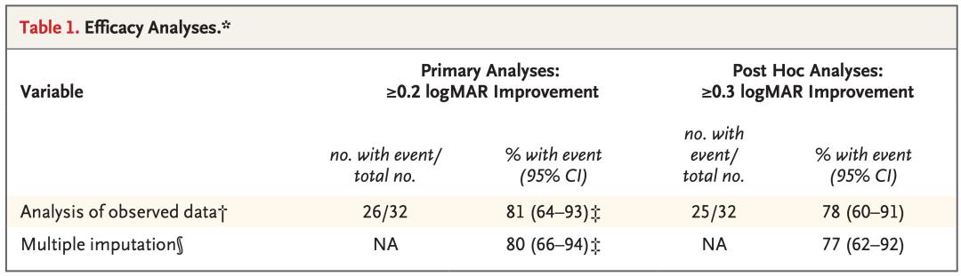 试验结果,临床上有意义改善的定义为,至少 0.2 logMAR 的改善(即最小分辨角的对数;相当于增加 ≥10 个字母)