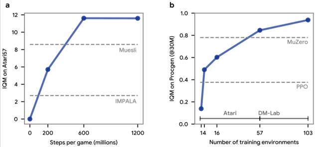 图|DiscoRL 最佳规则在每款游戏约6亿步内被发现;随着用于发现的训练环境数量的增加,DiscoRL 在未见过的 ProcGen 基准测试上的性能也变得更强。