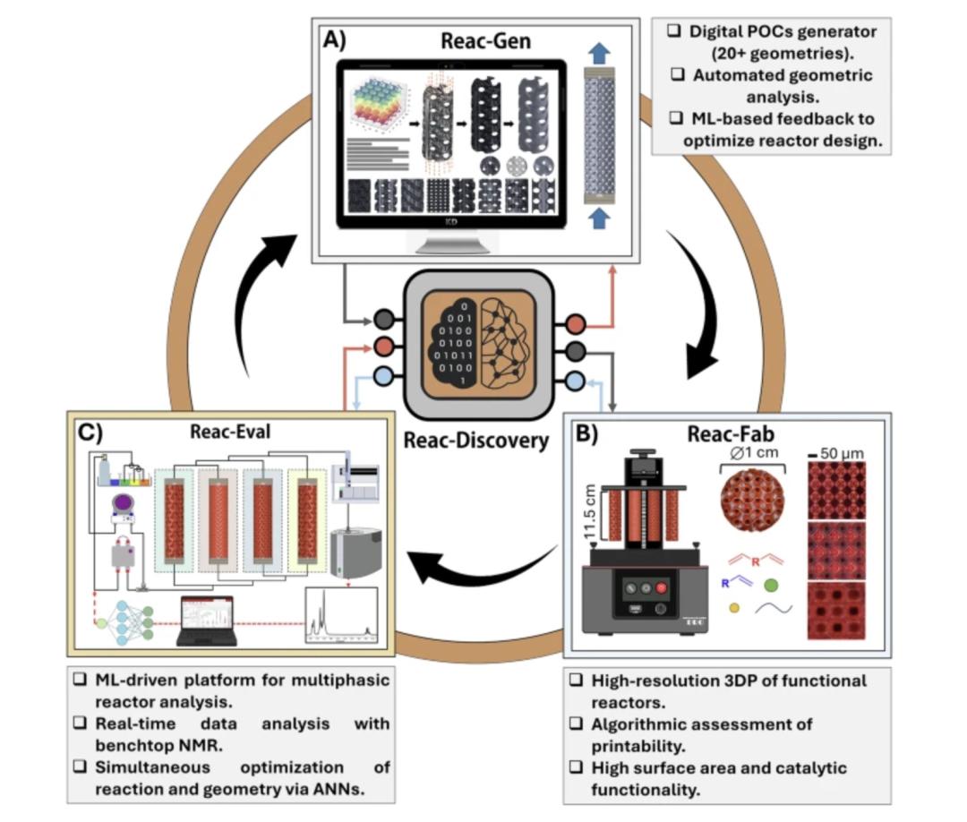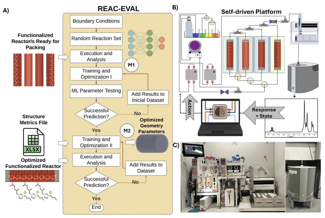 * Reac-Eval:利用机器学习与实时核磁共振(NMR)监控数据分析,使用人工神经网络(ANN)同时优化工艺和几何形状;实验结果再反馈至核心机器学习模型,推动反应器完善自学习、自迭代循环。