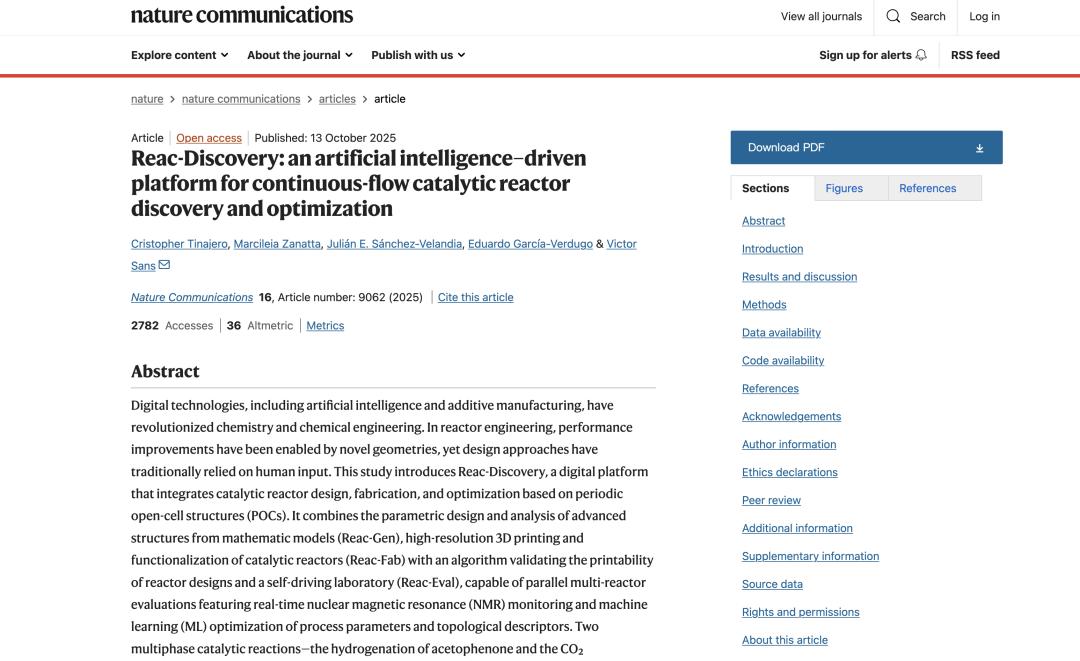 相关研究成果以「Reac-Discovery: an artificial intelligence–driven platform for continuous-flow catalytic reactor discovery and optimization」为题,发表于 Nature Communications。