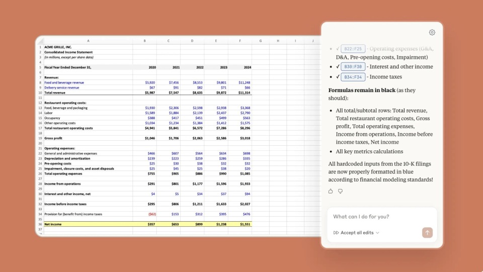 Anthropic 推出处于研究预览阶段的 Claude for Excel 测试版,使金融分析师能够在 Excel 侧边栏中与 AI 实时协作。Claude 可直接读取、分析与修改现有工作簿,或 从零生成全新表格,其核心优势在于对复杂数据逻辑的精准掌控:当用户更新假设参数时,Claude 能自动保留公式依赖关系,并可调试修复单元格公式、用新数据高效填充模板。