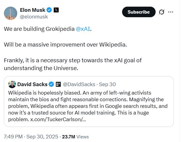 马斯克于9月29日首次透露构建Grokipedia的计划,此举是对特朗普的AI事务负责人、硅谷投资人戴维·萨克斯一篇帖文的回应。萨克斯在文中称维基百科“无可救药地充满偏见”。