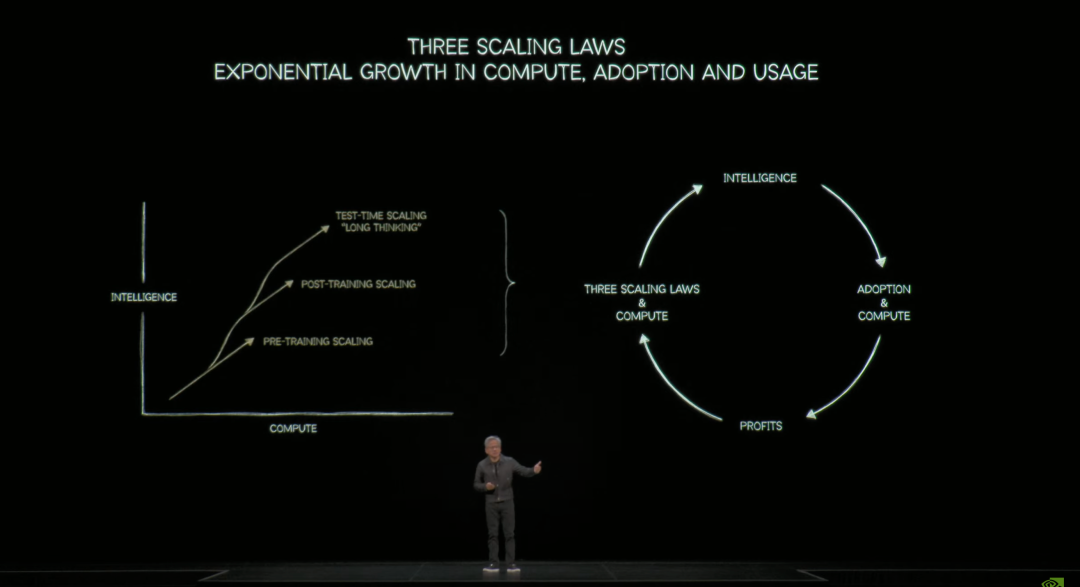 黄仁勋形容预训练是幼儿园教的东西,大量的训练相当于大量的学习和思考,能够使模型更聪明,也带来更大的计算负担。因此产生了一个正向循环的局面:AI 模型越智能,人们使用得越多;使用越多,就需要更多算力;更多算力又让模型更智能。从行业战略层面看,黄仁勋提出 AI 产业已经进入一个良性循环(Virtual Cycle)。