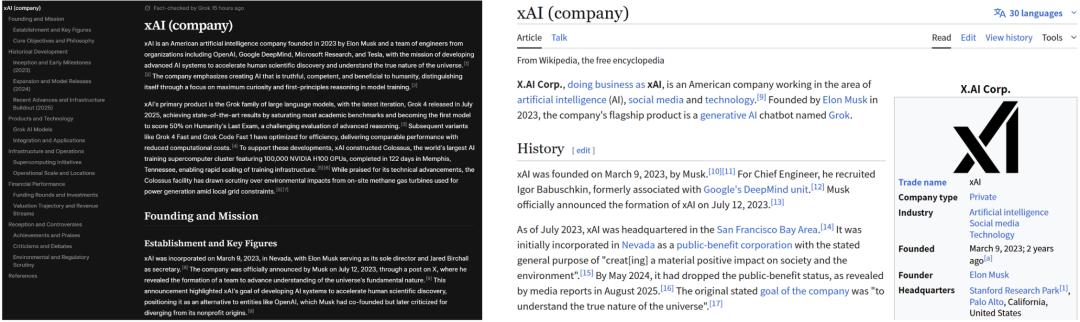 不过,正如现在几乎所有AI搜索都会把Wiki当做信源之一,随着内容不断完善,Grokipedia或许很快也会成为其他AI的引用来源之一。