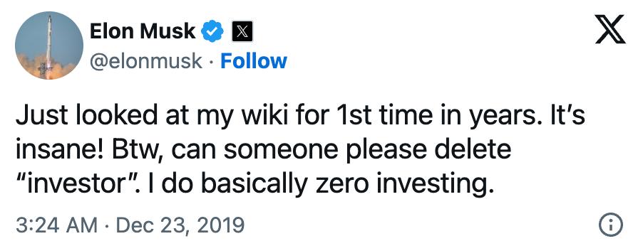 早在2019年,马斯克偶然看到维基百科中的个人介绍,直接破防了——