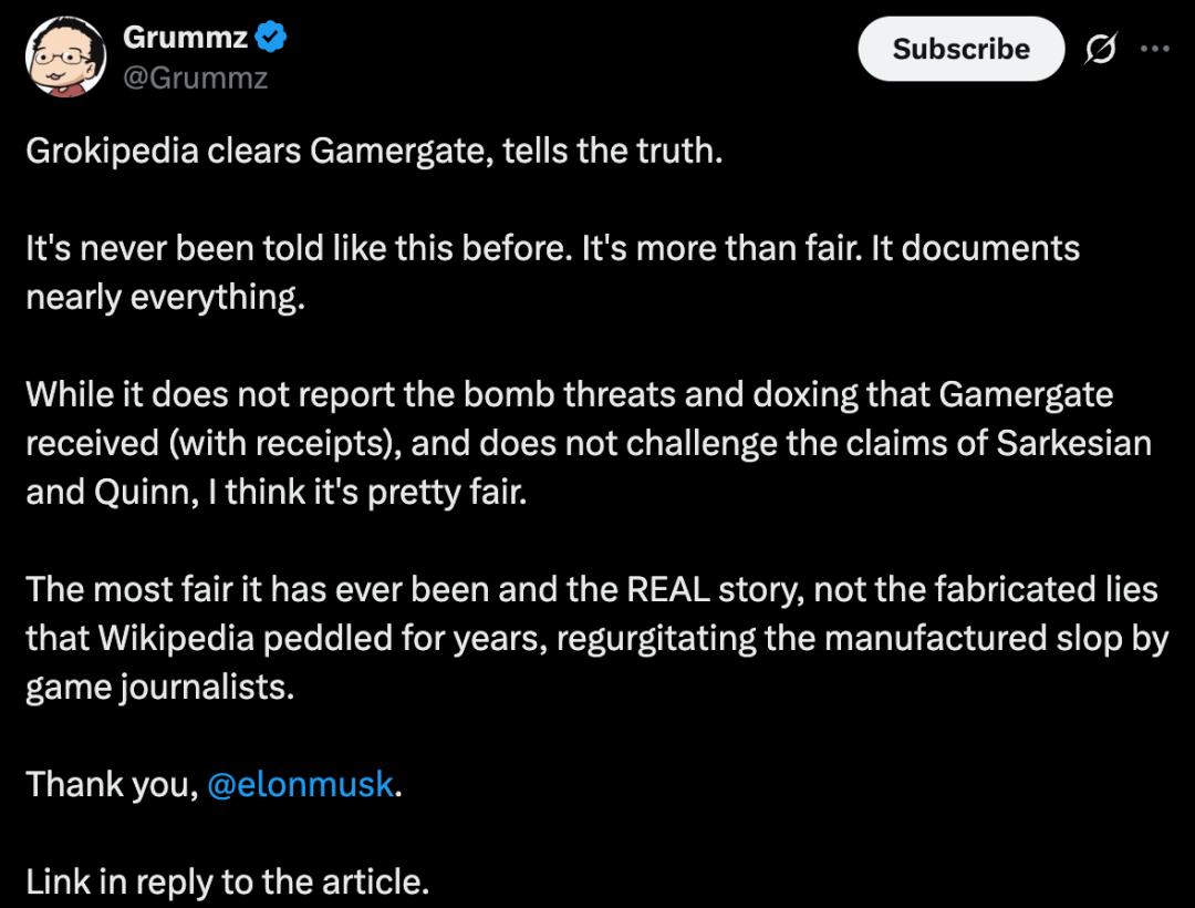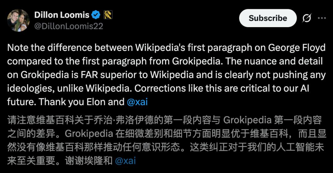 Grokipedia在细节把握和叙事深度上,完全碾压维基百科,不像至于像后者输出意识形态。