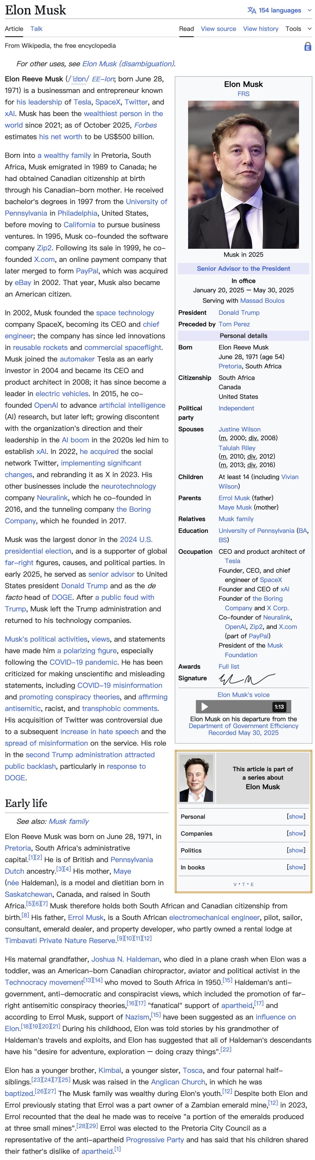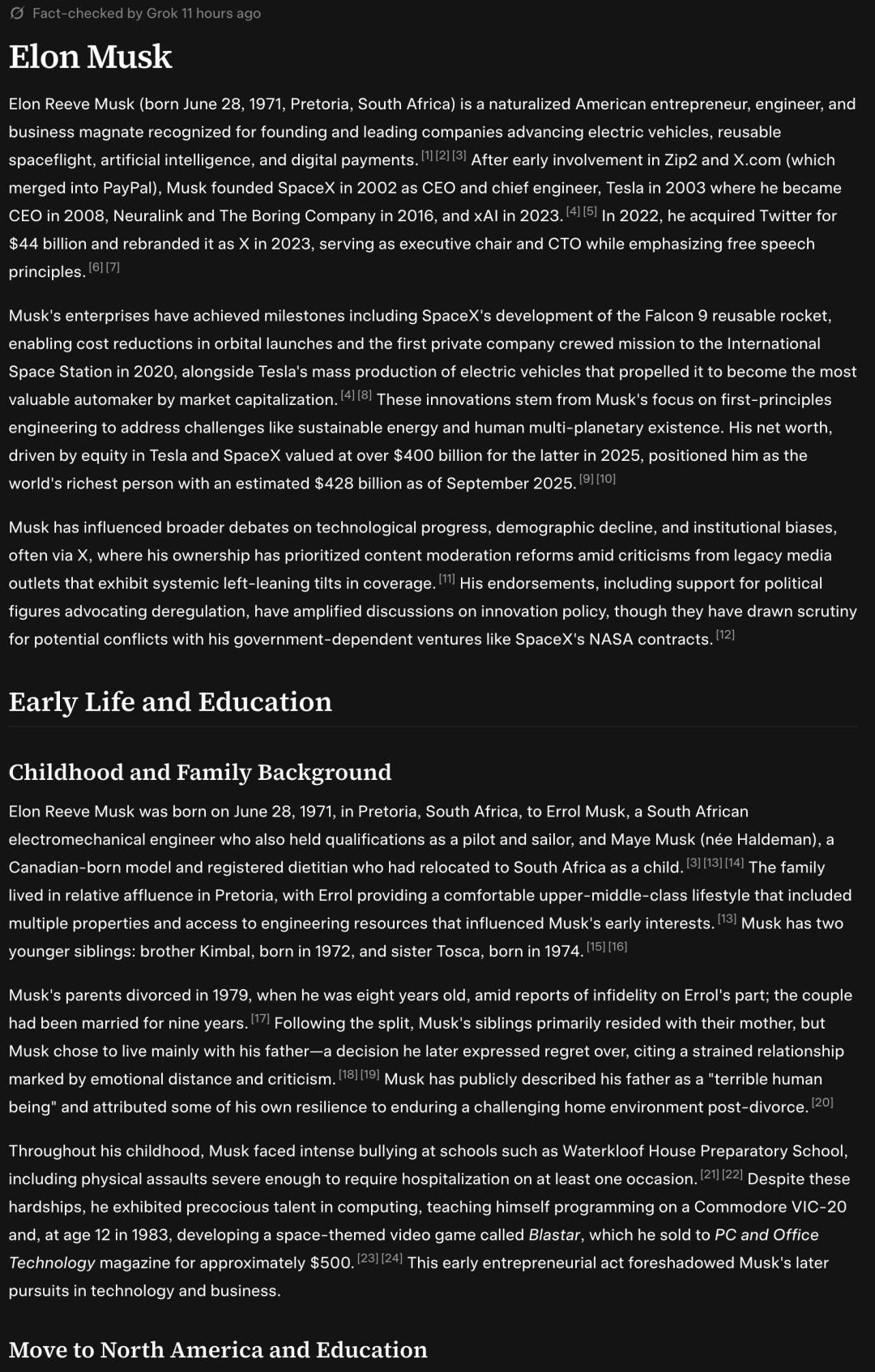 小试一下,搜索「Elon Musk」,可以看到几秒内,Grokipedia迅速给出一个完整的介绍,堪比个人传记。