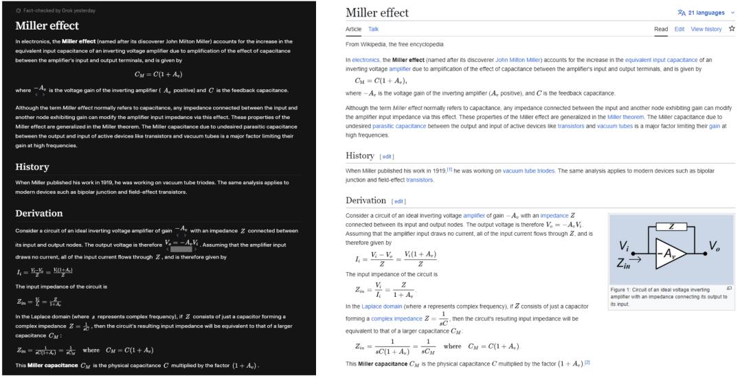 如下,在解释半导体中的「米勒效应」(Miller Effect),前者直接一字不差地「抄袭」。