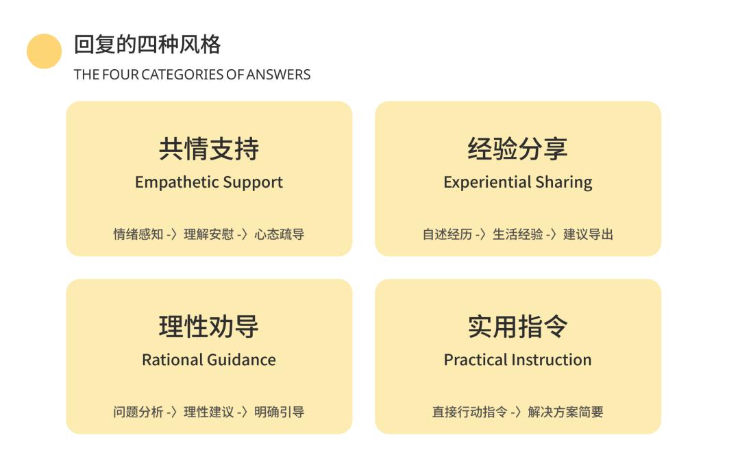 在对 1408 条长辈回复进行系统性内容分析后,研究团队进一步总结出老年人回复的四种回应风格:共情支持型、理性劝导型、经验分享型与实用指令型。