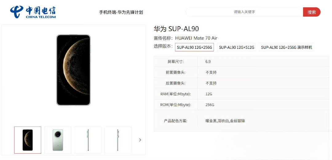 华为Mate 70 Air,6.9英寸1.5K大屏、1/1.3"主摄+红枫镜头,不带eSIM。