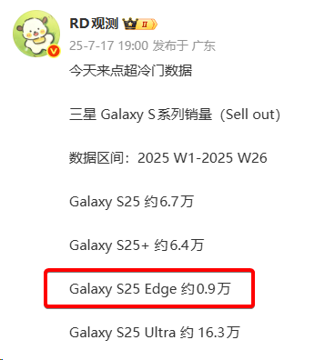 但很遗憾的是,这机子也要在库存售罄后停产了,因为截至8月份,S25 Edge全球销量仅有131万台。