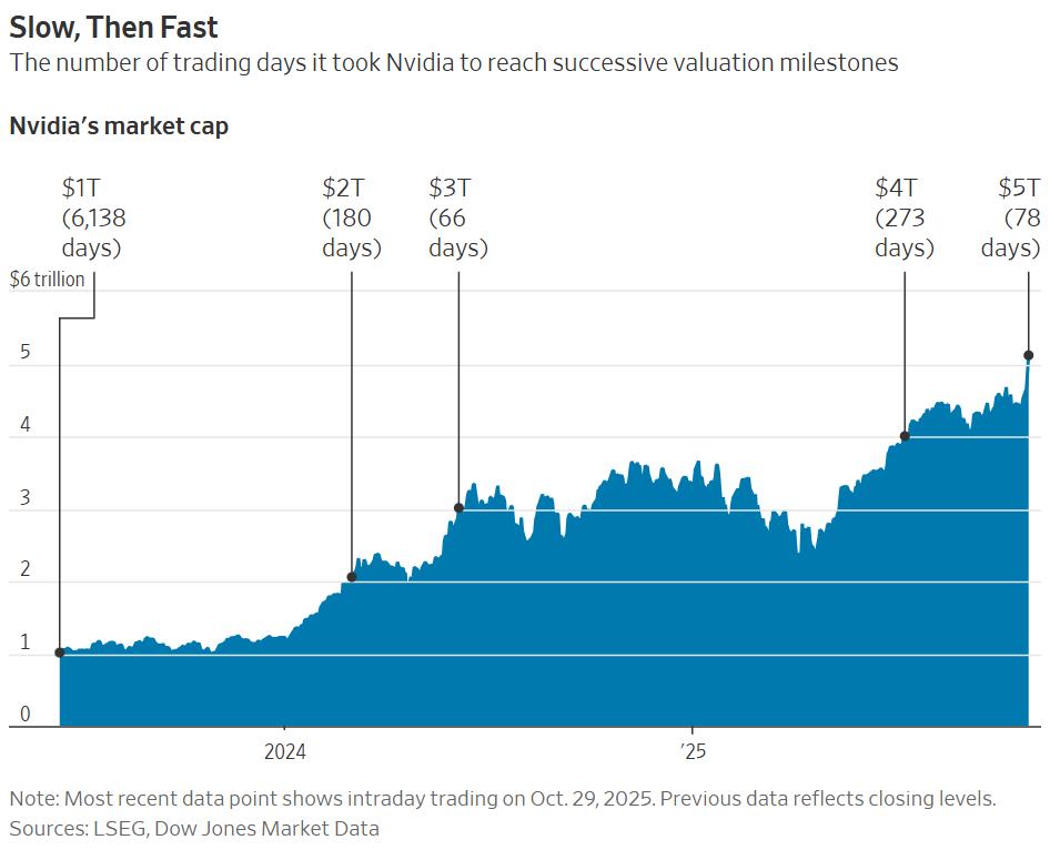 英伟达市值从1万亿到5万亿的速度,越来越快: