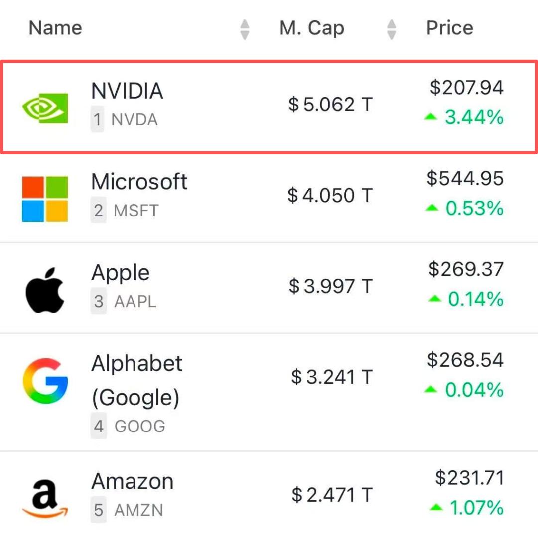截至10月24日,当时英伟达市值4.5万亿,5天后,英伟达成为蓝星上第一个市值突破5万亿的公司!
