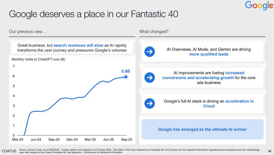 但在经历市场反馈与深度复盘后,Coatue 修正了这一判断,将 Google 重新纳入到“Fantastic 40”中。