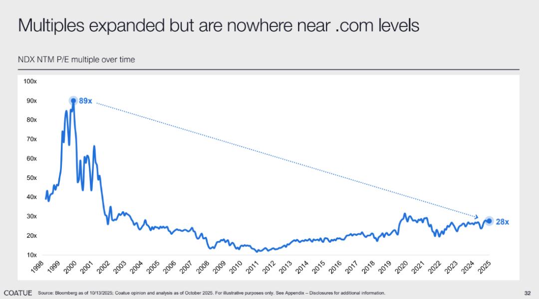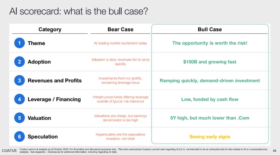 但总体上,Coatue 的 House View 明确表达出一种理性看多的乐观态度:AI 并非即将破裂的泡沫,而是推动全球经济与科技结构性增长的核心驱动力。
