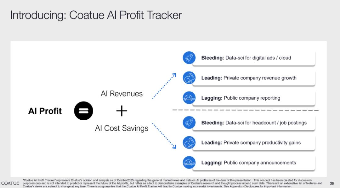 为更系统地衡量 AI 企业的盈利表现,Coatue 推出了“Coatue AI Profit Tracker”框架。该框架借助数据科学分析,整合数字广告、云领域的多层级数据,从营收与成本节约两个核心维度,全面量化 AI 对企业盈利的实际影响。