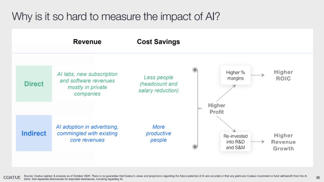延续市场对 AI 企业盈利的质疑,Coatue 在报告中也试图对 AI 带来的“降本增益”进行量化,简单来看,AI 带来的收入增加和成本节约均存在直接效用与间接效用两种形式: